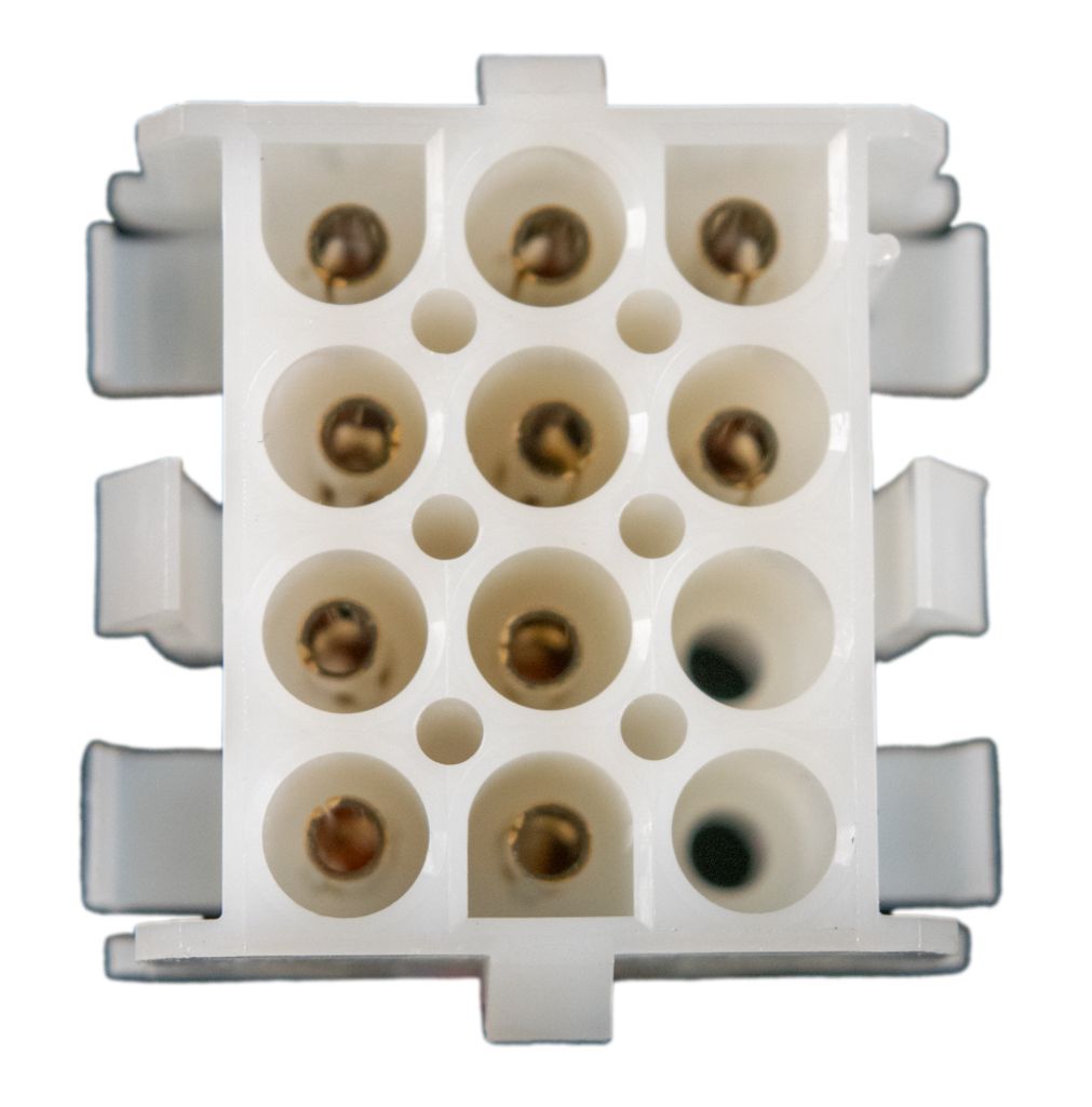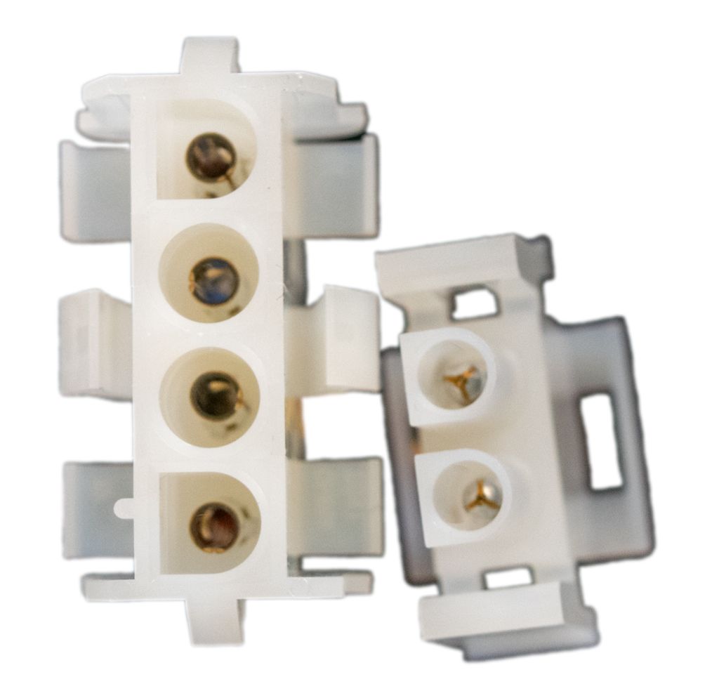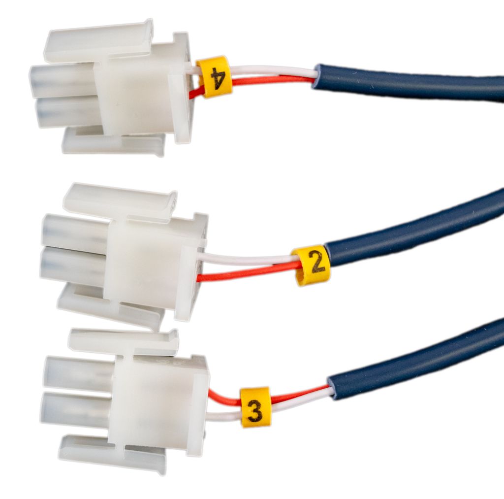 Den 12-poliga kontakten ansluts till förstärkaren . Den röda och svarta strömkabeln ansluts till en 13 V DC-strömkälla, till exempel en Aquatic AV- transformator . Fyra kablar ansluts till högtalare och en till en subwoofer.