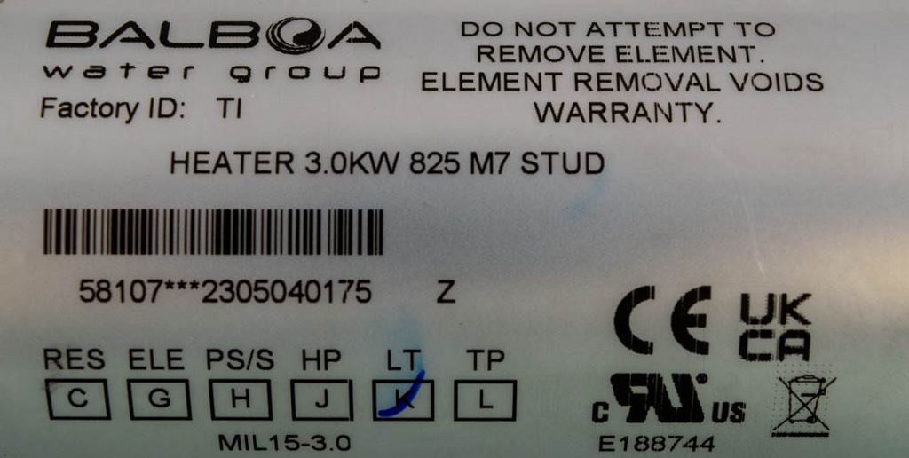 Den har ett Incoloy-element, vilket är perfekt för de flesta krav. Om du däremot använder salt-vatten i ditt spabad, så behöver du en värmare med titanium-element!