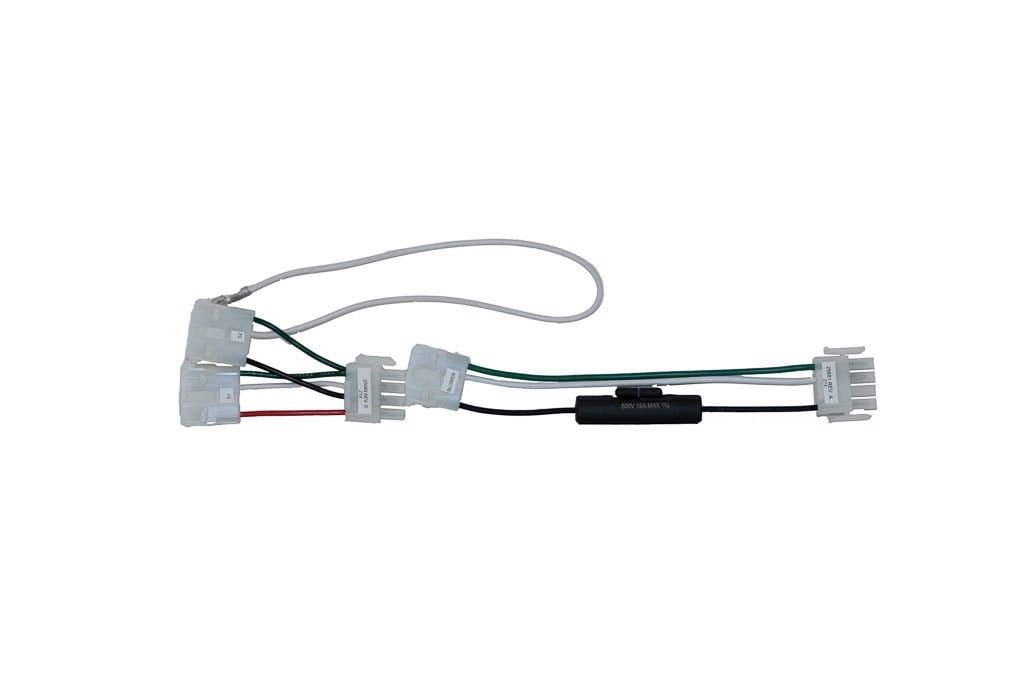 Kabeln till en säkringshållare för en 10A säkring för fläkten. Delningskabeln (tillgänglig separat) på höger sida gör att du kan installera två enhastighetspumpar i stället för en tvåhastighetspump.