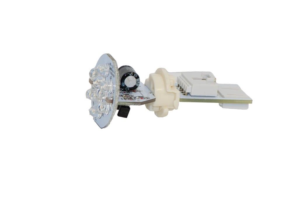 This 9-LED colour changing bulb is manufactured by J&J. It has two 5 pin electrical connectors, which allows you to daisy-chain several slave lights and keep them synchronised for the colour changes.