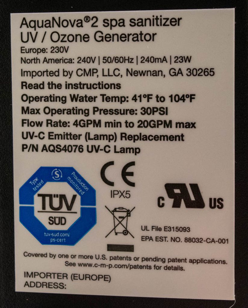 DEL AOP Spa AquaNova 2 är en kombination av ozonator och UV-C desinfektionssystem med ett inbyggt venturi-insprutningssystem. Den är effektiv för badtunnor och pooler med en volym på upp till 20 000 liter.