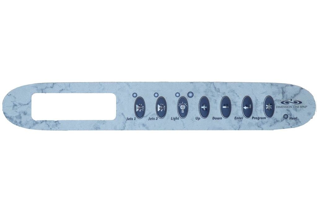 Beskrivning av Dimension One (D1) Overlay för TSC-24, 7 knappar: Jets 1, Jets 2, Light, Up, Down, Enter, Program