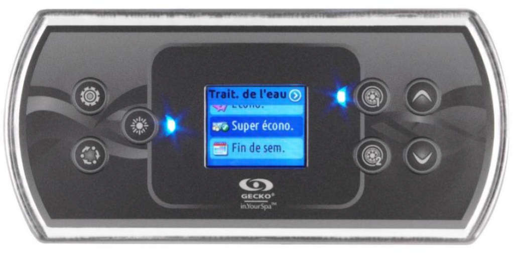 Beskrivning av Gecko AeWare IN.K500 Styrpanel - Settings, Light, Mode, Pump 1, Pump 2, Up, and Down