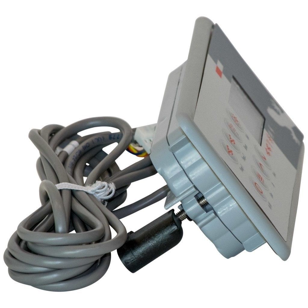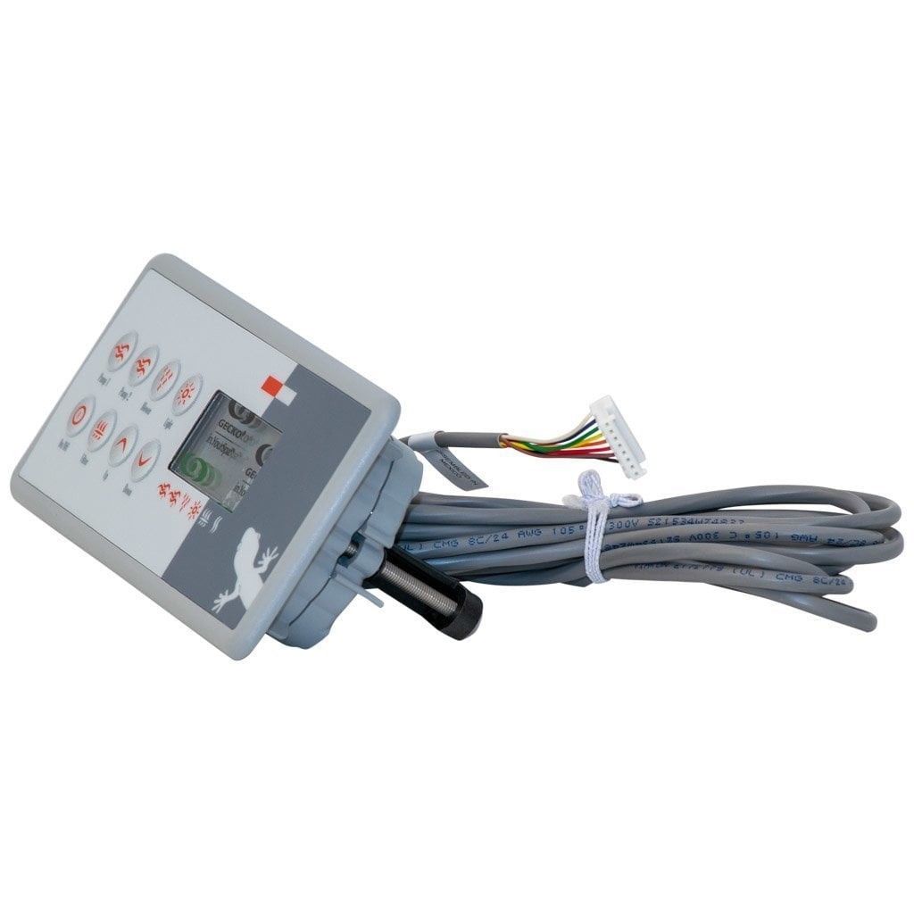 7-knapps kontroll på ovansidan som används på Gecko spa-kontrollpaket. Modellinformation finns på baksidan av panelen.