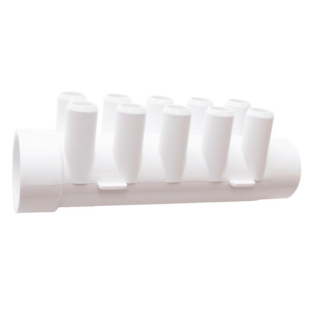 Detta ABS-grenrör används för att ansluta pumprören till vatten- eller luftstrålerören. Den har ett 1,5-tums han- och 1,5-tums honinlopp och tio släta utlopp för att ansluta till 3/4-tums rör.