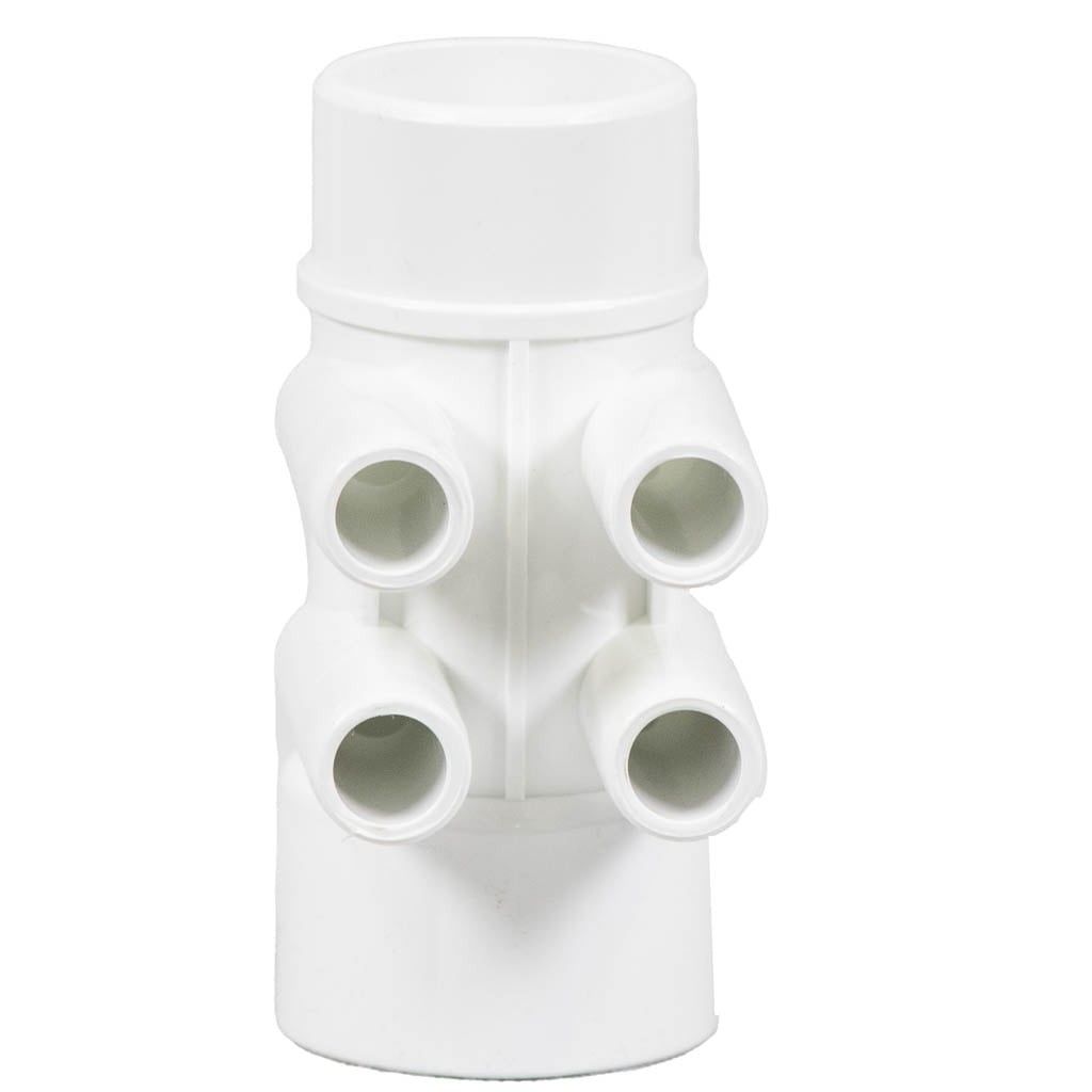 Detta ABS-grenrör används för att ansluta pumprören till vatten- eller luftstrålerören. Den har ett 1,5-tums han- och 1,5-tums honinlopp och fyra släta utlopp för att ansluta till 3/4-tums rör.