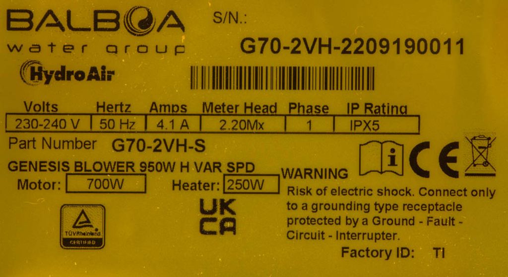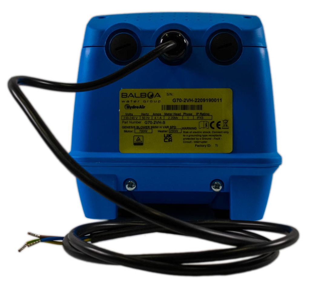 Denna fläkt med variabel hastighet från HydroAir passar de flesta bärbara spabad. Den låter dig välja intensiteten på luftstrålen samt dess värme vid munstyckets utlopp. Fläkten är på 700W och luftvärmaren 250W, för en total förbrukning på 950W.