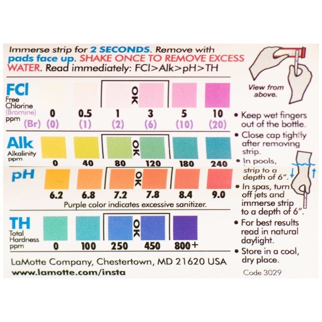 | Ytterligare anmärkningar: | 50 fri klor, brom, alkalinitet, pH och hårdhetstestare. Hur man använder - Sänk ned remsan, virvla 3 gånger, ta bort med kuddarna uppåt, skaka inte av överflödigt vatten. Håll blöta fingrar borta från flaskan. |
