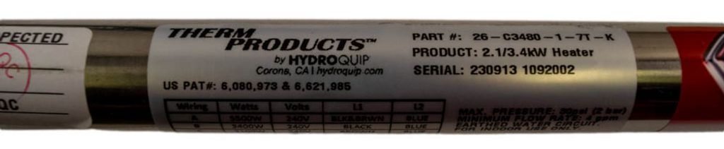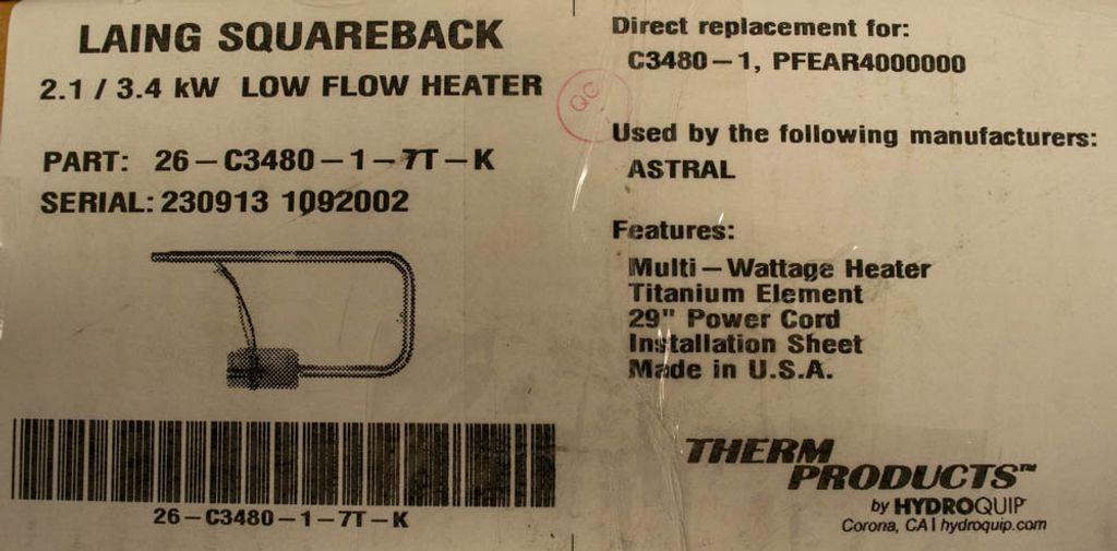 Denna 5,5 kW böjda värmare tillverkas i USA av företaget HydroQuip. Med ett titanelement kan den ersätta Astrels PFEAR4000000-modell, som inte längre finns på marknaden.