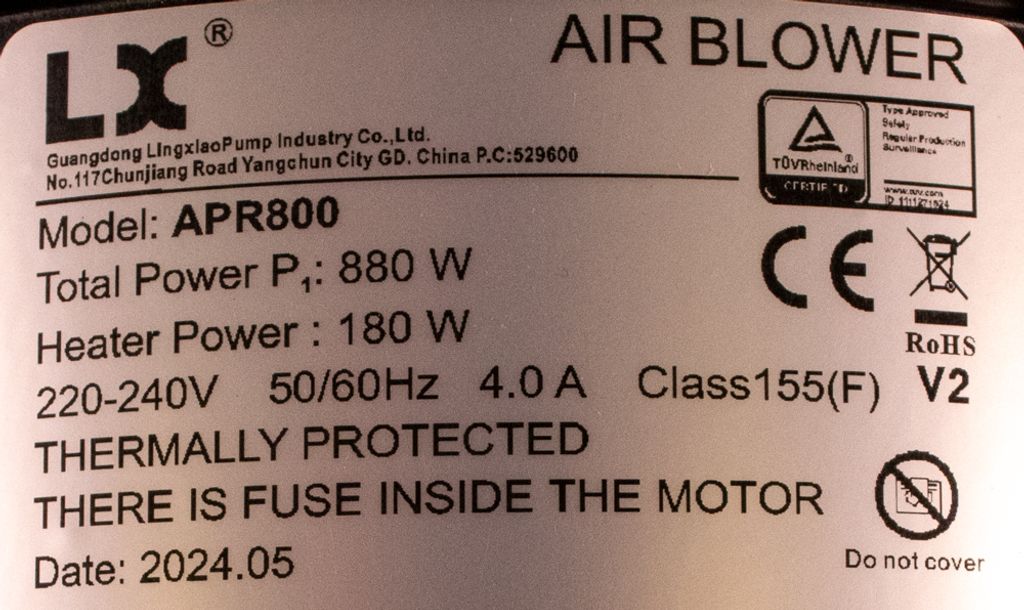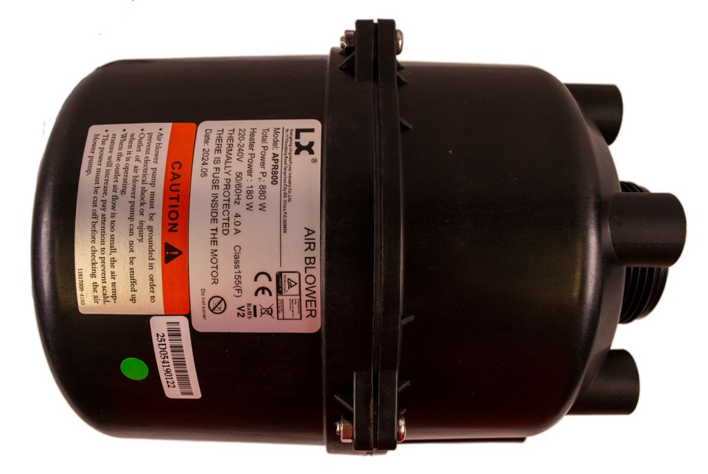 LX Whirlpool APR800-V2 är luftpump med en fläkt på 700W fläkt och en värmare på 180W. Den kan användas som ersättning för pooler i olika storlekar, allt från badkar till spa och swimspa. Höljet är förstärkt och designat för att motstå höga temperaturer.