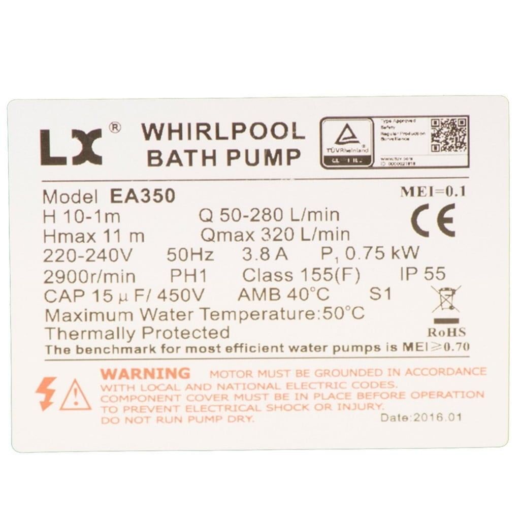LX Whirlpool EA350 är en vanlig cirkulationspump men det finns även tillfällen där den används som massagepump. Pumpen har en motor på 0.75 kW / 1.0 hk.Nu med ny förbättrad axeltätning (sedan slutet av 2016)!