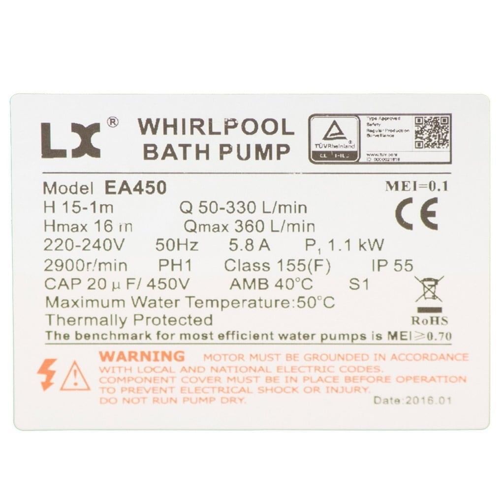 LX Whirlpool EA450 är en vanlig cirkulationspump men det finns även tillfällen där den används som massagepump. Pumpen har en motor på 1.1 kW / 1.5 hk.