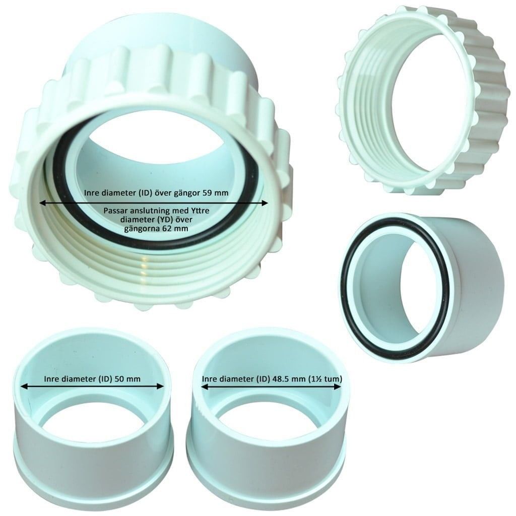EA450-pumpen levereras med kopplingar och o-ringar för 1,5-tumsrör (48 mm diameter).