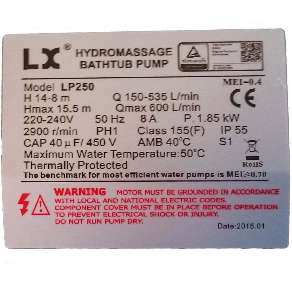 LX Whirlpool LP250 är en mycket vanlig massagepump. Pumpen har en motor på 1.85 kW / 2.5 hk.