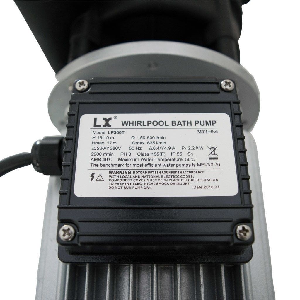 LX Whirlpool är en av de största tillverkarna av pumpar till spabad och bubbelbad. LX Whirlpool LP300 är en mycket vanlig massagepump. LX Whirlpool LP300T har samma specifikation som LP300 men är 3-fas 380V istället för 1-fas 220V. Pumpen har en motor på 2.2 kW / 3.0 hk.