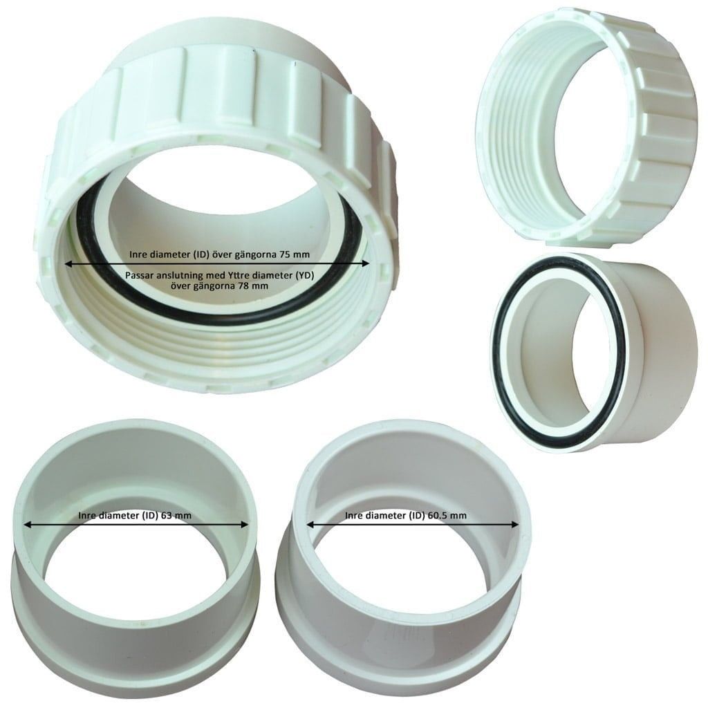 | Anslutning sug-sida | Centrerat / Mitten Ytterdiameter över gängorna: ca 78 mm Gäng delning/stigning (avstånd mellan gängtoppar): 1/8 tum eller ca 3.1 mm Passar rör/slang: Ytterdiameter 60 mm eller 60.5 mm (2.0 tum) |