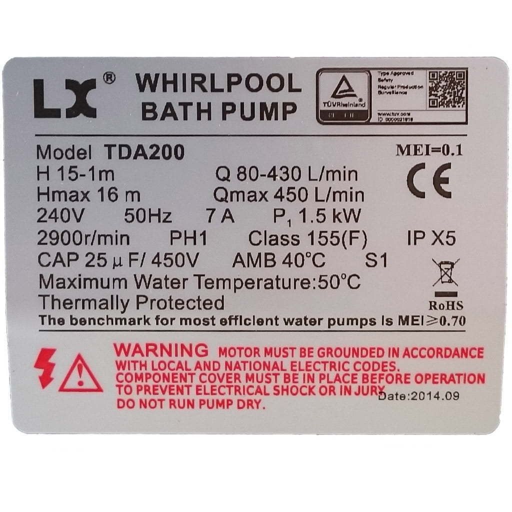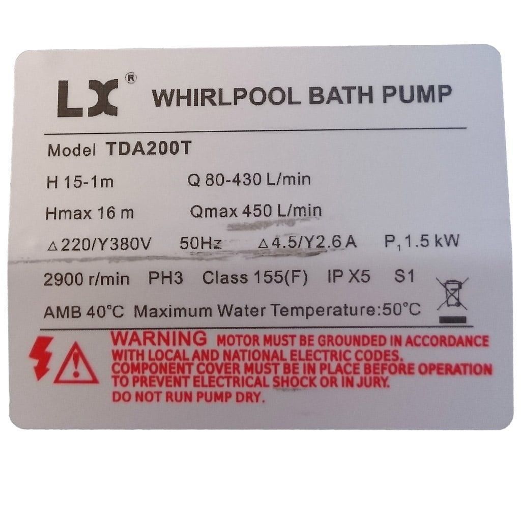 LX Whirlpool är en av de största tillverkarna av pumpar till spabad och bubbelbad. LX Whirlpool TDA200T används normalt som massagepump. Pumpen har en 3-fas motor på 1.5 kW / 2.0 hk.