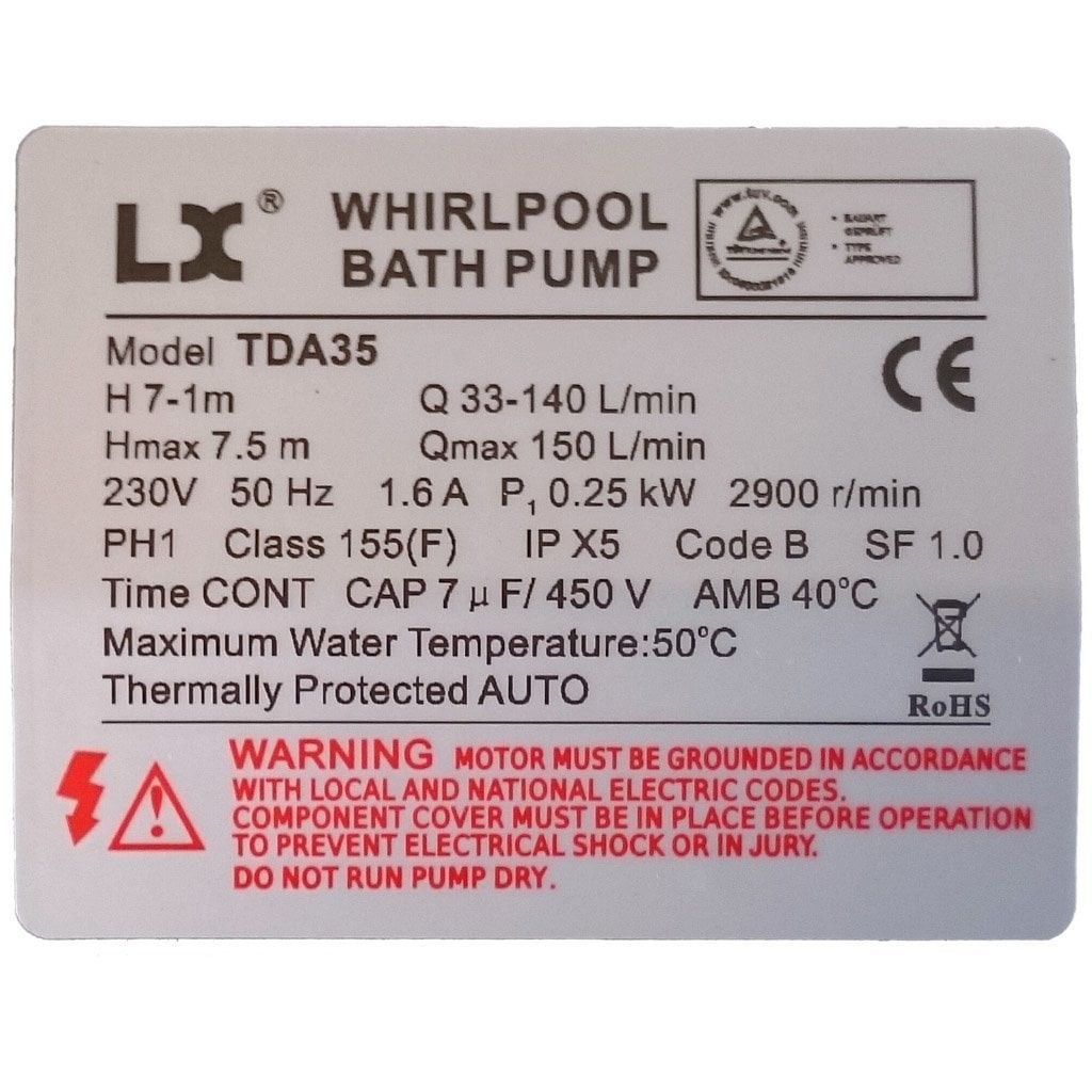 LX Whirlpool är en av de största tillverkarna av pumpar till spabad och bubbelbad. LX Whirlpool TDA35 är en vanlig cirkulationspumpen på marknaden. Pumpen har en motor på 0.25 kW / 0.35 hk. Nu med ny förbättrad axeltätning (sedan slutet av 2016)! Pumphus och impeller av förstärkt plast. Motorram av aluminium.