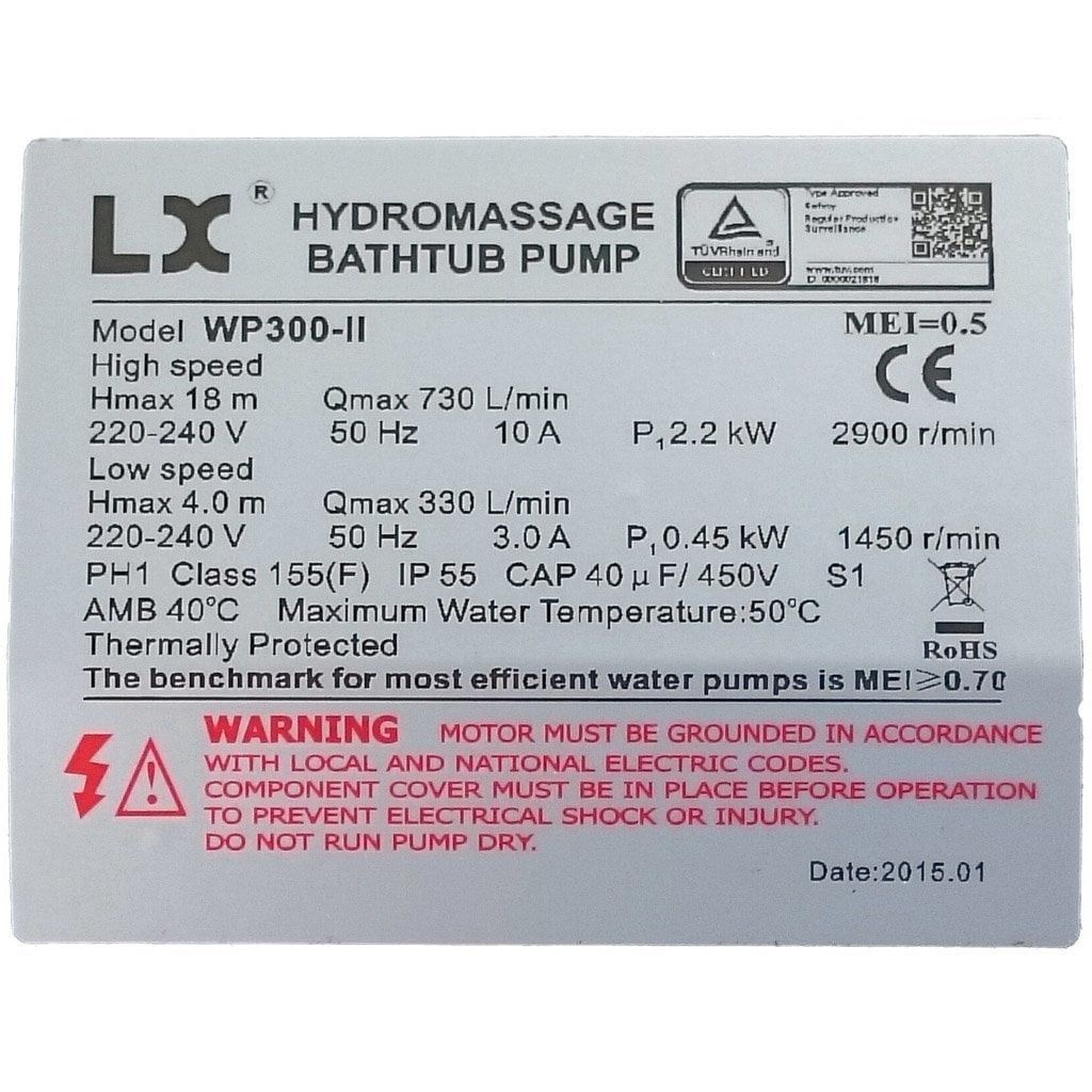 LX Whirlpool WP300-II är en pump med två växlar, vilket gör att den normalt används både som cirkulationspump och som massagepump. Pumpen har en motor på 2.2 kW / 3.0 hk. Nu med ny förbättrad axeltätning (sedan slutet av 2016)!