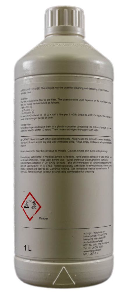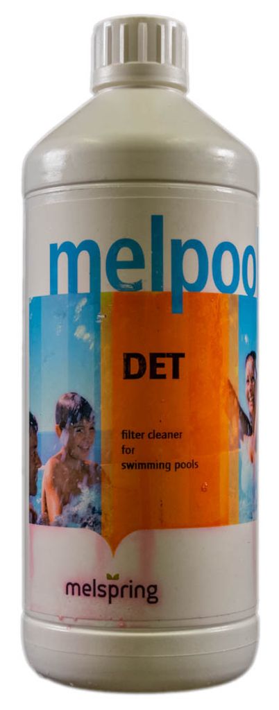 Melpool DET förfilter rengör ditt poolfilter. Lösningen hälls i sandfiltret före backspolningen så att de större smutspartiklar och fläckar spolas bort från filtret och därmed ökar filtrets effektivitet och livslängd.