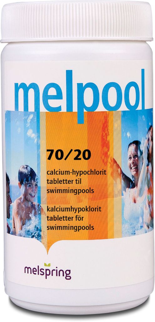 Beskrivning av Melpool Klor, tablett 20g, 70% tillgängligt klor, Kalciumhypoklorit, Ca (ClO) 2, 5kg