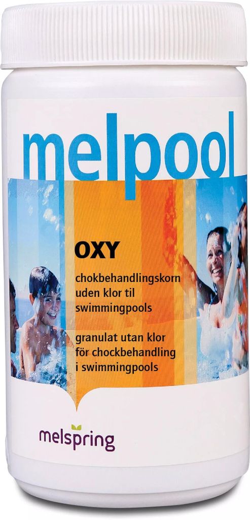 Melpool Oxy är en klorfri oxidant som används för chockbehandling. Jämfört med klorbaserad chockbehandling är poolen redo att simma i ett par timmar efter en Oxy-chock.