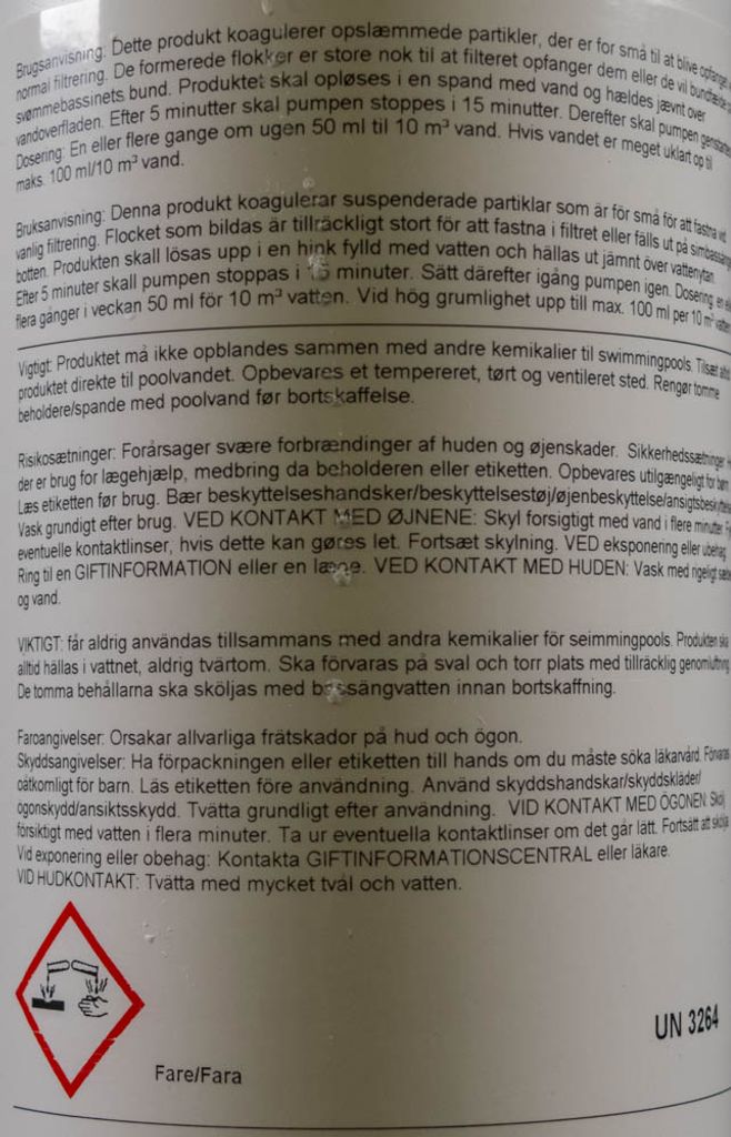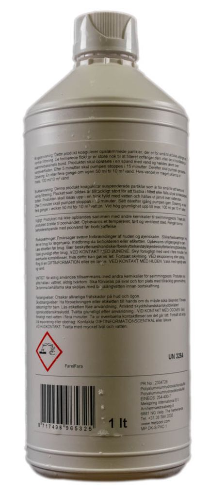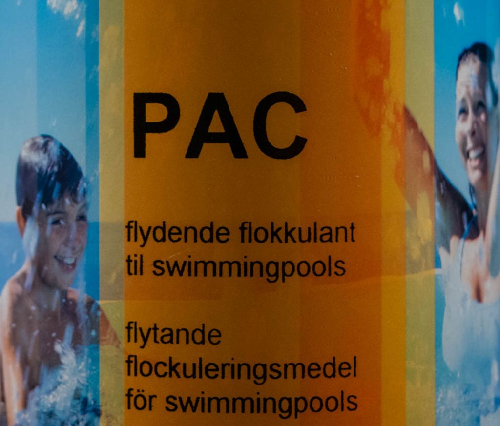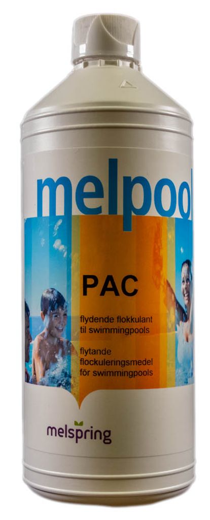 PAC är en högpresterande oorganisk polymer baserad på aluminiumhydroxidklorid. PAC är idealisk för att avlägsna grumlighet, föroreningar och missfärgning av poolvatten genom att neutralisera suspenderat och kolloidalt material för att framställa fasta flingor, som fälls ut och kan avlägsnas av skimmeren eller filtret. När PAC tillsätts i poolen ska filtret vara stängt i 10-12 timmar så att de tunga partiklarna kan sjunka till botten av poolen.