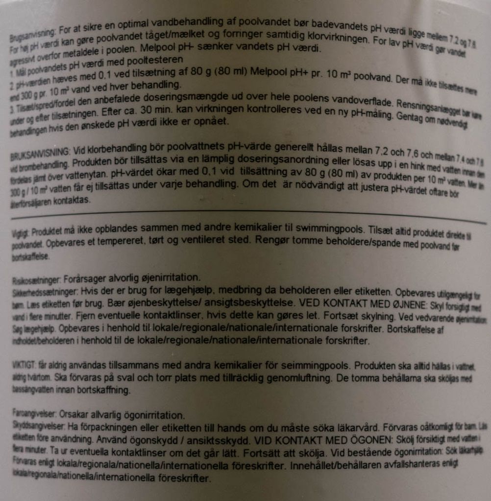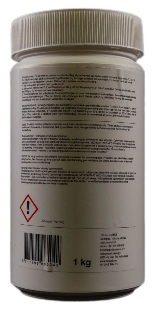 pH+ granulat höjer poolens pH-värde och balanserar den totala alkaliniteten. Poolen hålls normalt vid ett pH mellan 7,2 - 7,6 och en total alkalinitet mellan 80-140 ppm.