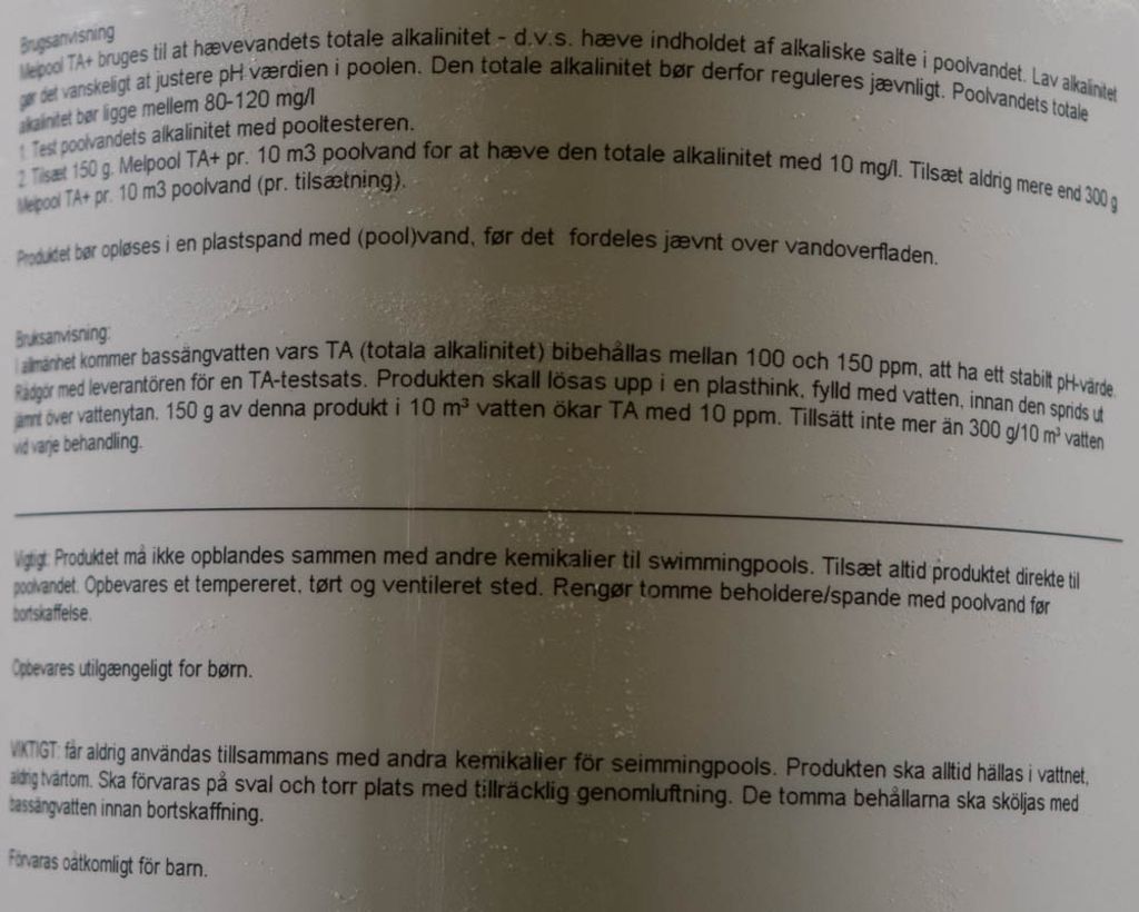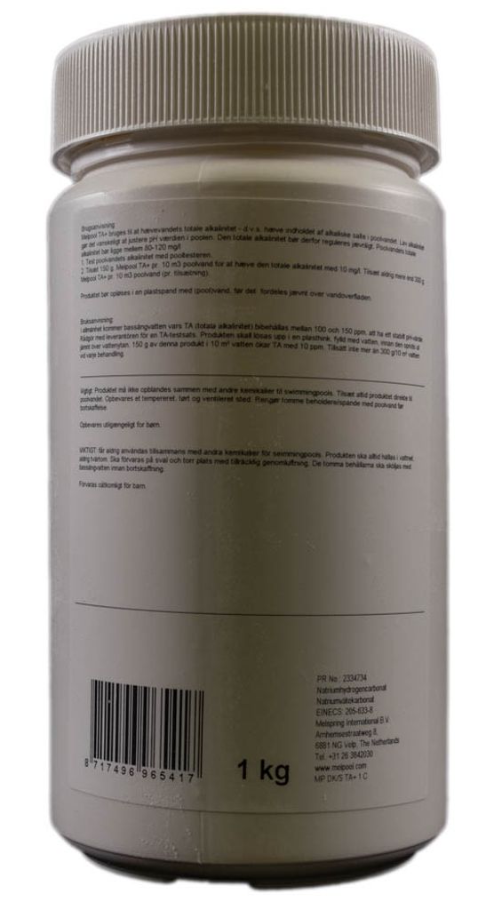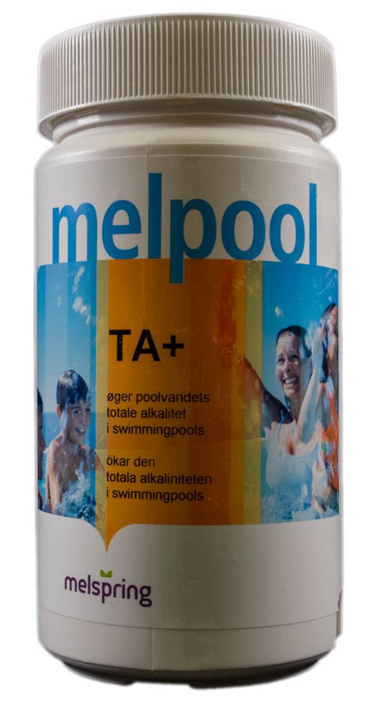 Melpool TA +, med ingrediensen natriumbikarbonat, används för att öka alkaliniteten i poolvattnet och stabiliserar pH. Den idealiska alkaliniteten i poolvatten ligger mellan 80 - 120 ppm. När alkaliteten är för låg blir väggputsen mottaglig för etsning, vilket orsakar fläckning av poolbotten samt metallisk korrosion. Hög alkalinitet gör poolen grumlig och klordesinficeringsmedlets effektivitet kommer att äventyras.