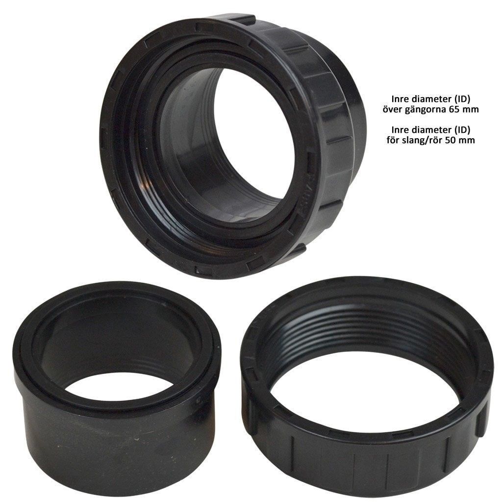 Denna pumpkoppling passar på Espa-pumpar med 65 mm utvändiga skruvgängor, som till exempel Wiper0 -serien. Ett 50 mm rör kan limmas på.