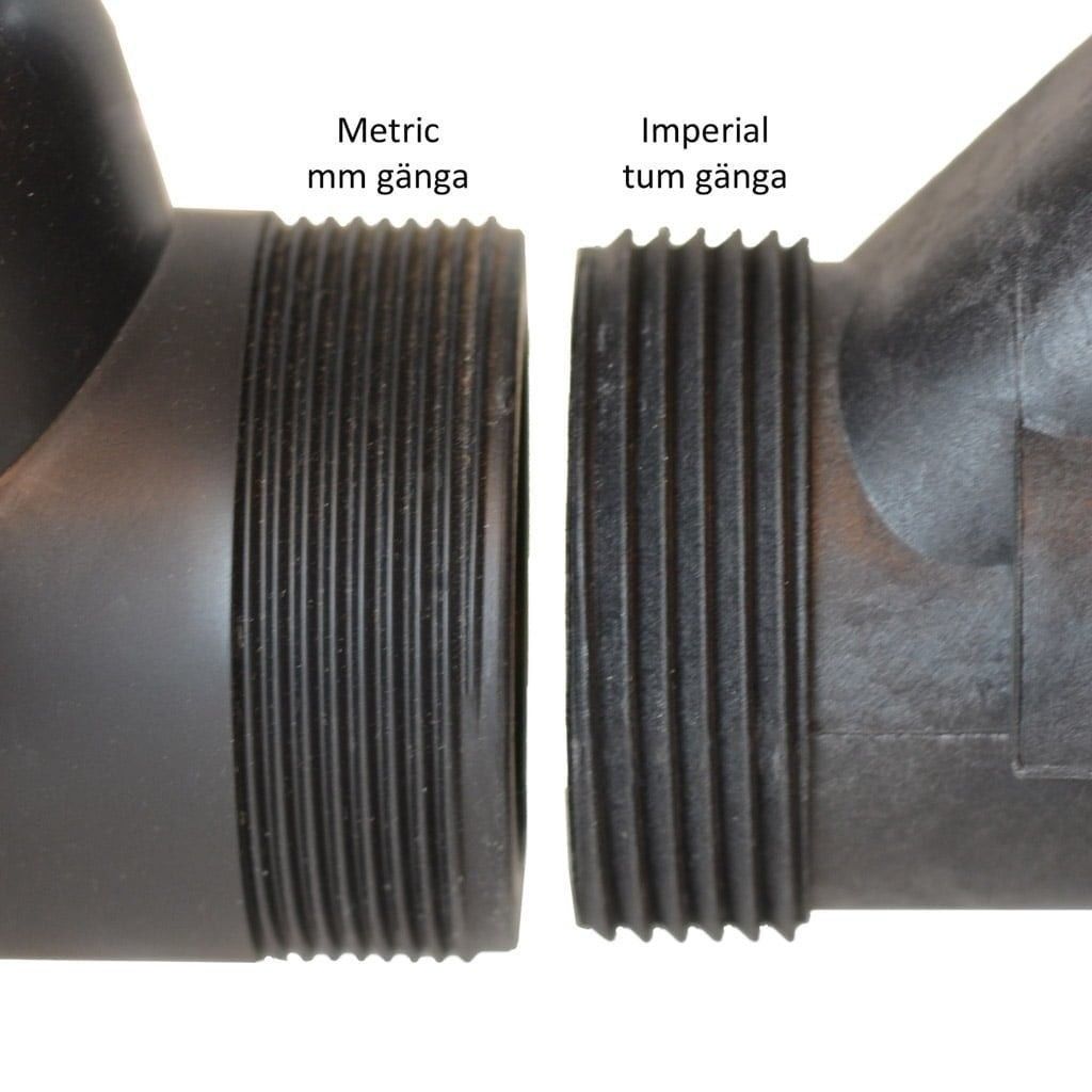 Typiskt för dessa pumpar är den fina gängan samt att det är olika diametrar på sug-och trycksidan.