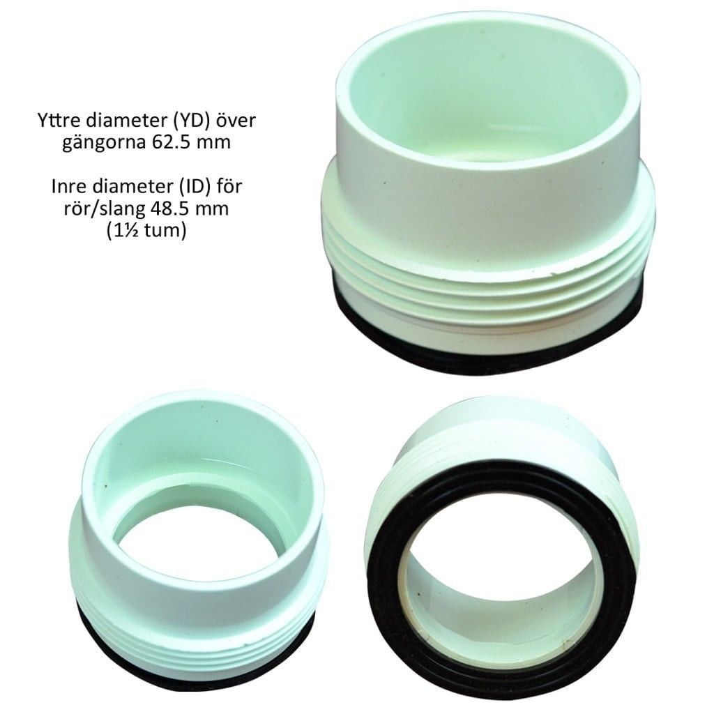 Skruvkoppling med ytterdiameter 62.5 mm över gängorna för slang eller rör med 50 mm eller 1.5 tum (48 mm) diameter.