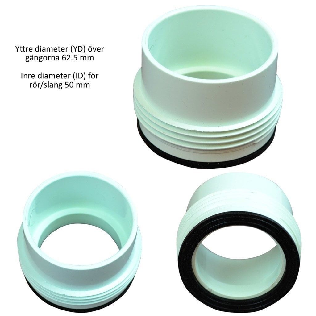 Skruvkoppling med ytterdiameter 62.5 mm över gängorna för slang eller rör med 50 mm eller 1.5 tum (48 mm) diameter.