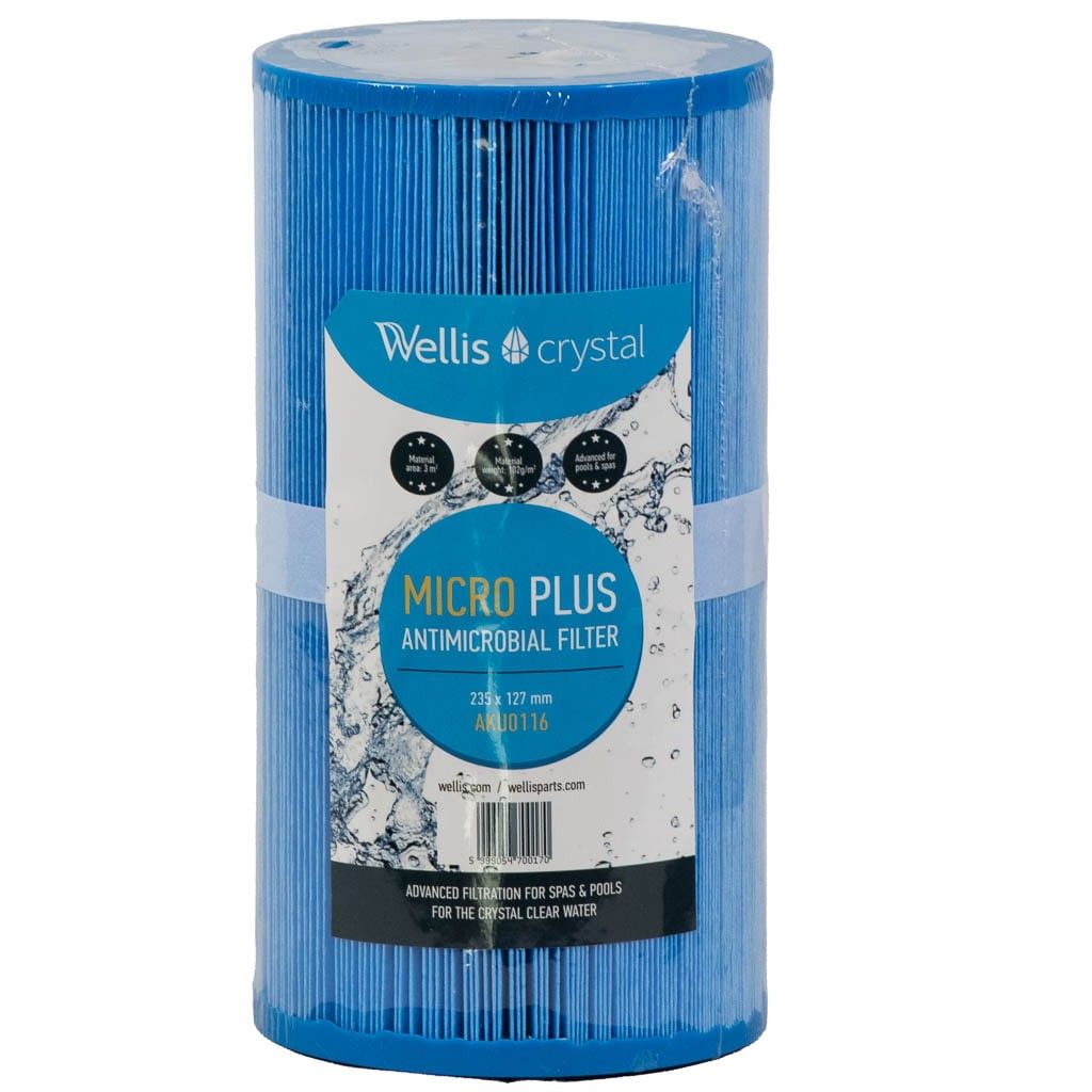 Beskrivning av Spa Filter L 235 mm; YD 125 mm; Pleatco antibakteriell; Wellis