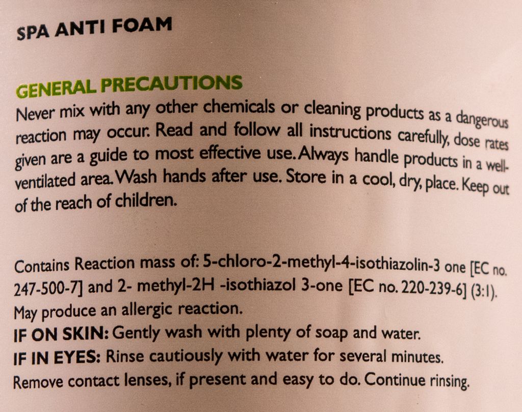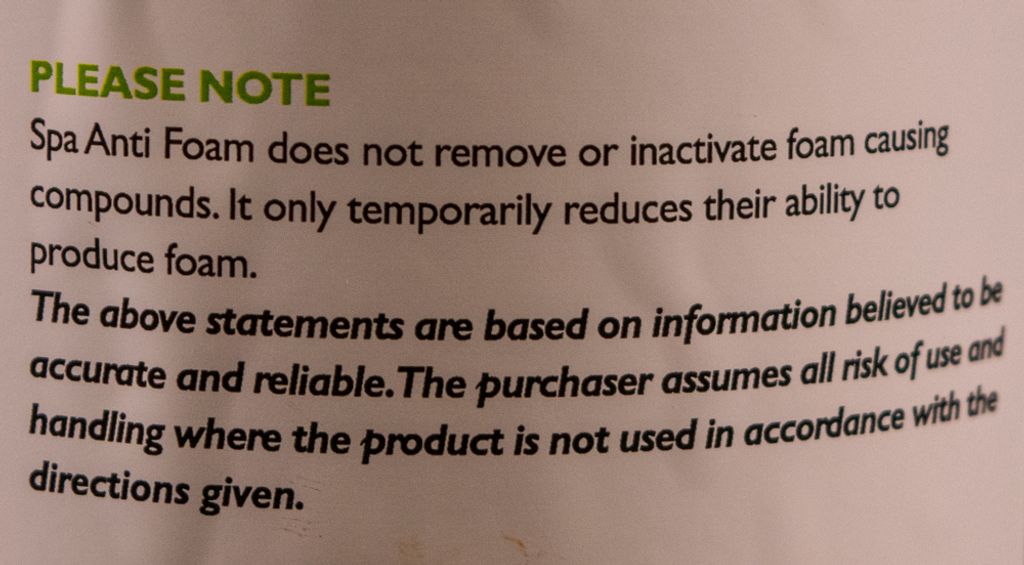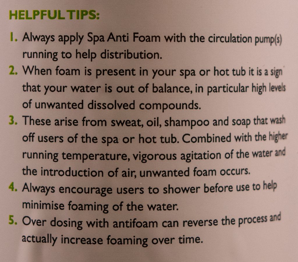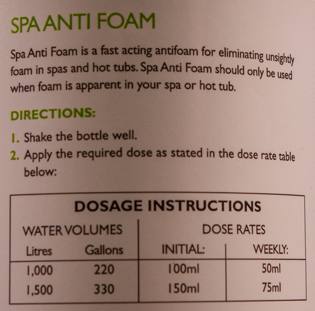Används för att reducera mängden skum som kan uppträda på vattenytan i ditt spa. Bör användas varje vecka för att förhindra att skum uppstår.