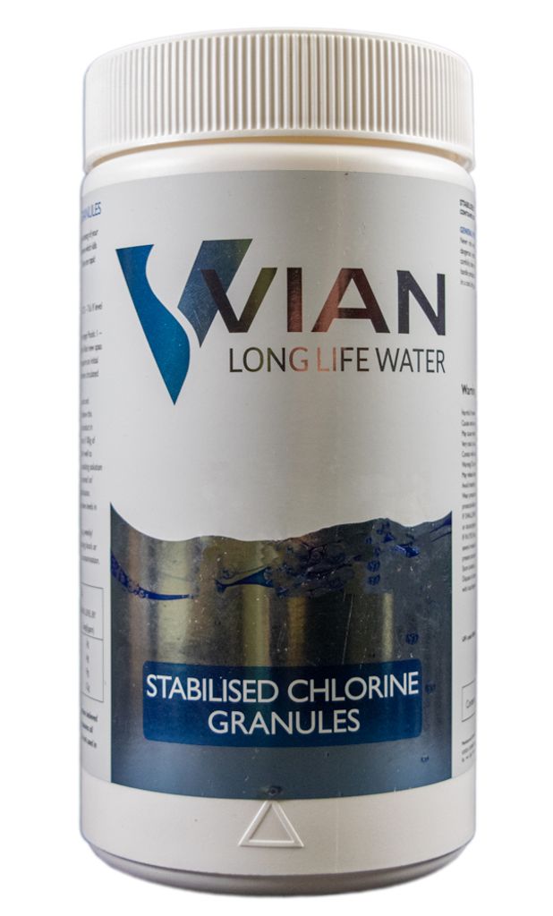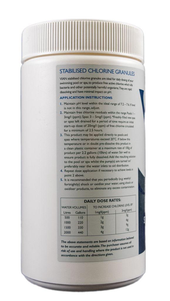 Fritt klor ska hållas vid 3.0 mg/l (ppm). För att öka med 1 mg/l (ppm), lägg i 2 gram granulat per 1000 liter vatten.